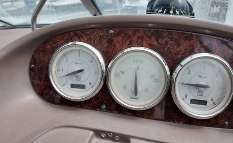 Wood steering wheel, burl wood dash, compass, and depth sounder